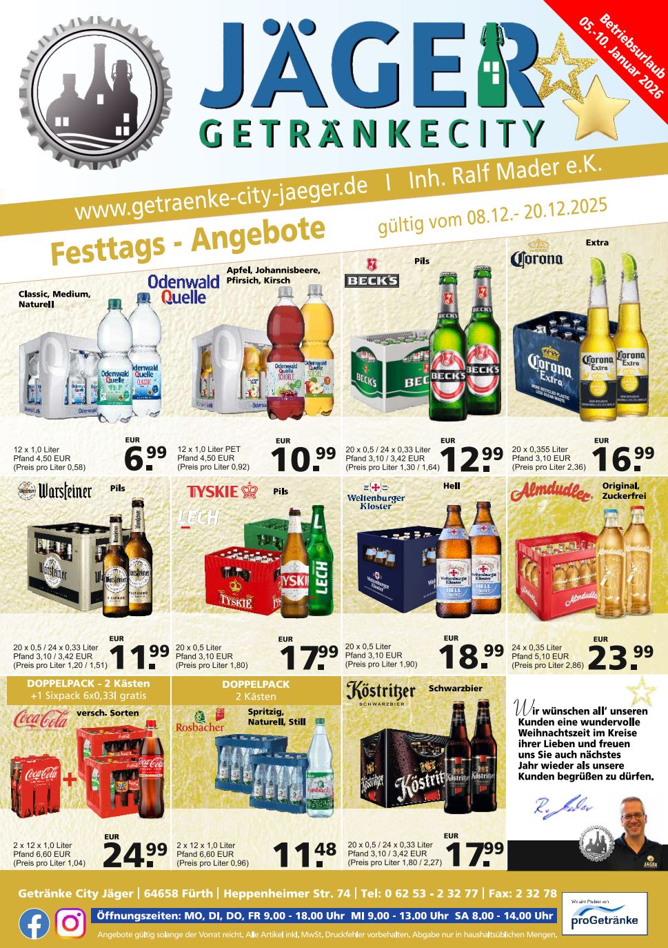 Öffnungszeiten: Mo./Di./Do./Fr. 9:00 – 18:00 / Mi. 9:00 – 13:00 / Sa. 8:00 – 14:00 Heppenheimer Str. 74, 64658 Fürth/Odw. – Tel: 06253 23277, Fax: 06253 23278